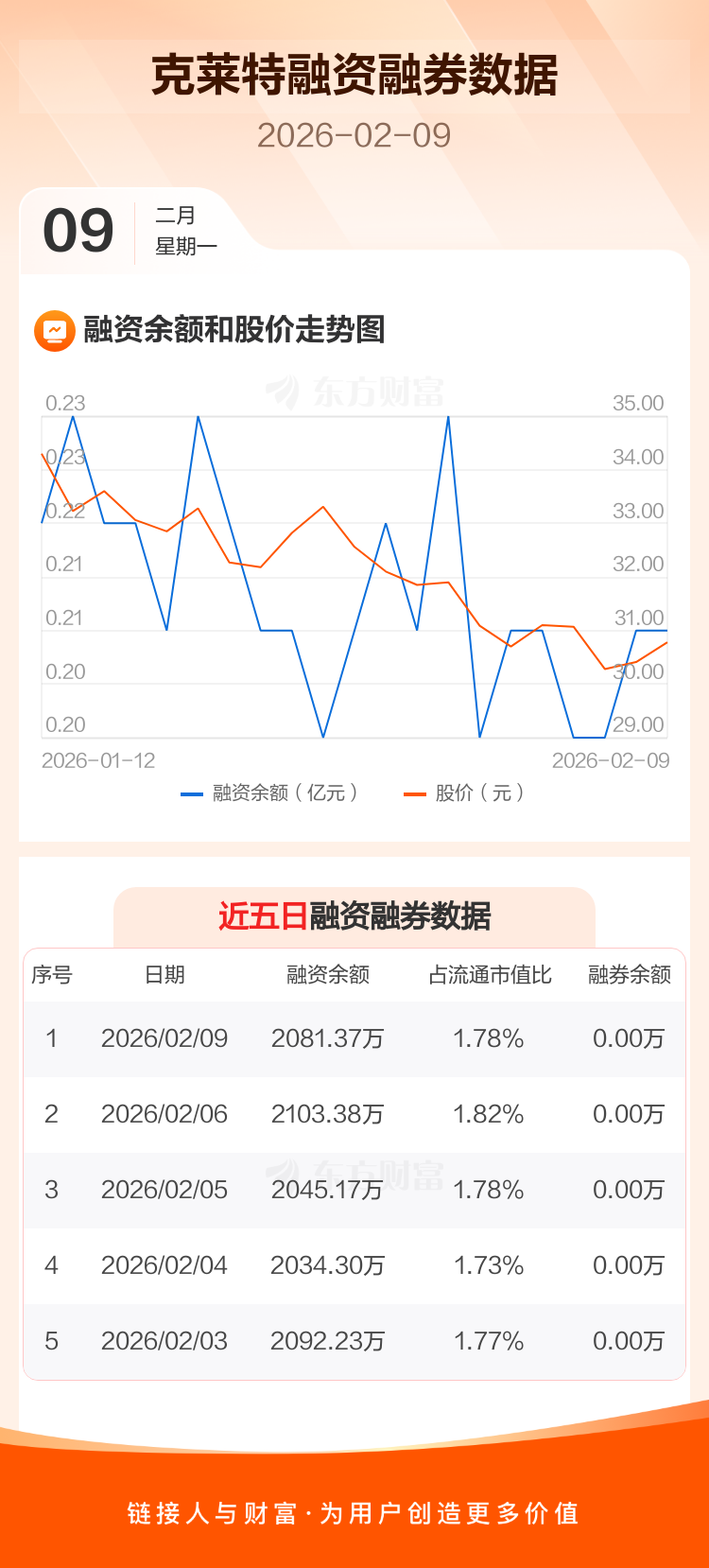 交易所最新数据显示,克莱特于2026年2月9日获融资买入120.04万元,融资偿还142.06万元,当日融资净偿还22.02万元。目前,该股融资余额2081.37万,占流通市值比例为1.78%。