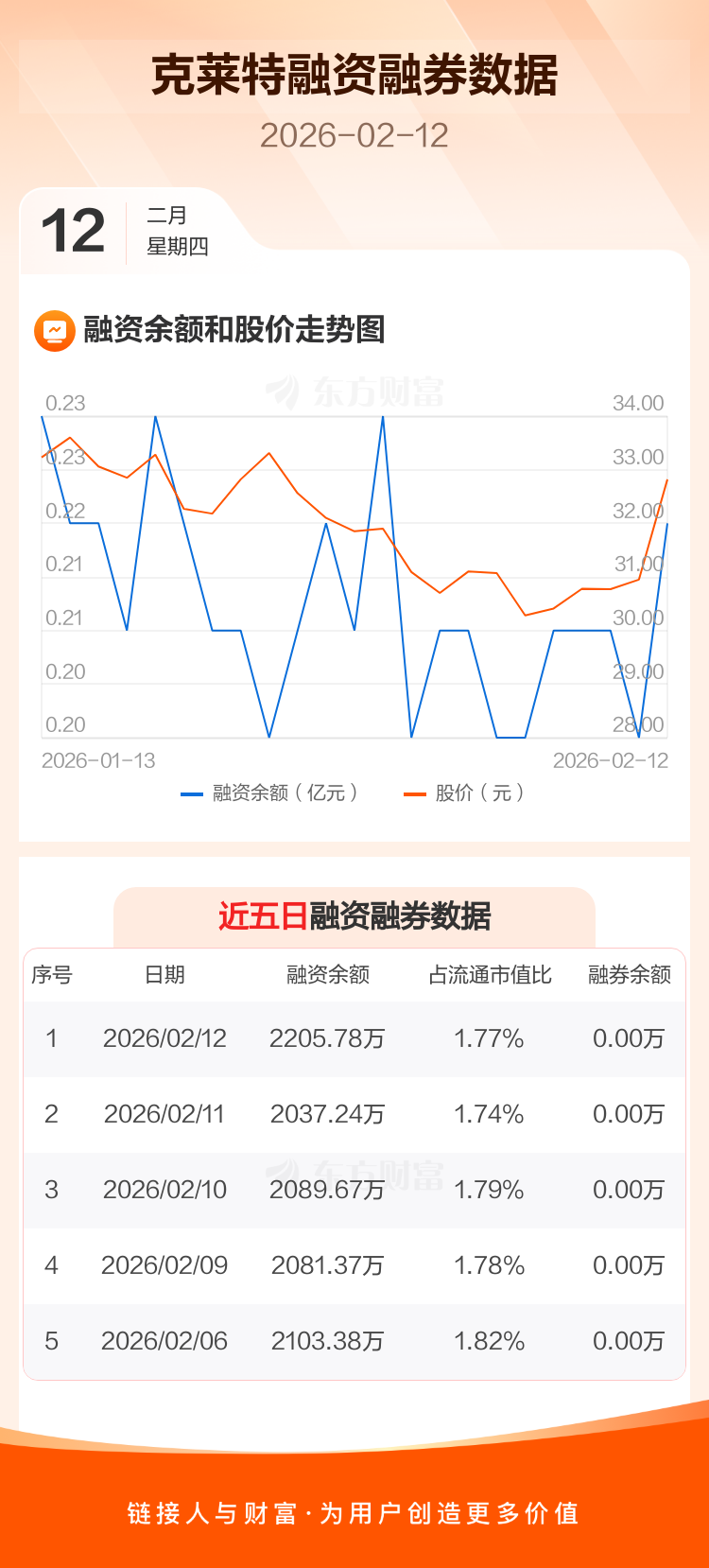 交易所最新数据显示,克莱特于2026年2月12日获融资买入403.08万元,融资偿还234.55万元,当日融资净买入168.53万元。目前,该股融资余额2205.78万,占流通市值比例为1.77%。