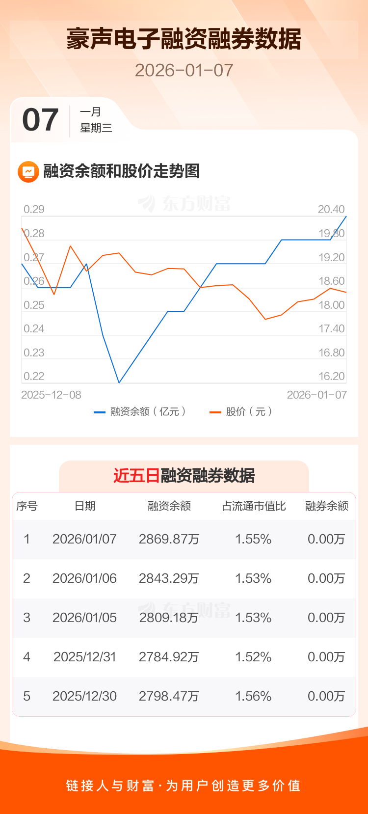 交易所最新数据显示,豪声电子于2026年1月7日获融资买入266.41万元,融资偿还239.83万元,当日融资净买入26.58万元。目前,该股融资余额2869.87万,占流通市值比例为1.55%。
