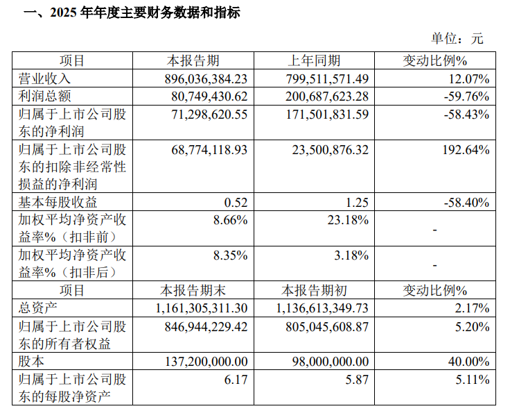 2月25日,北交所上市公司豪声电子(920701)发布2025年年度业绩快报。快报显示,公司2025年实现营业收入8.96亿元,同比上涨12.07%;归母净利润为7130万元,同比下降58.43%;扣非净利为6877万元,同比上涨192.64%。