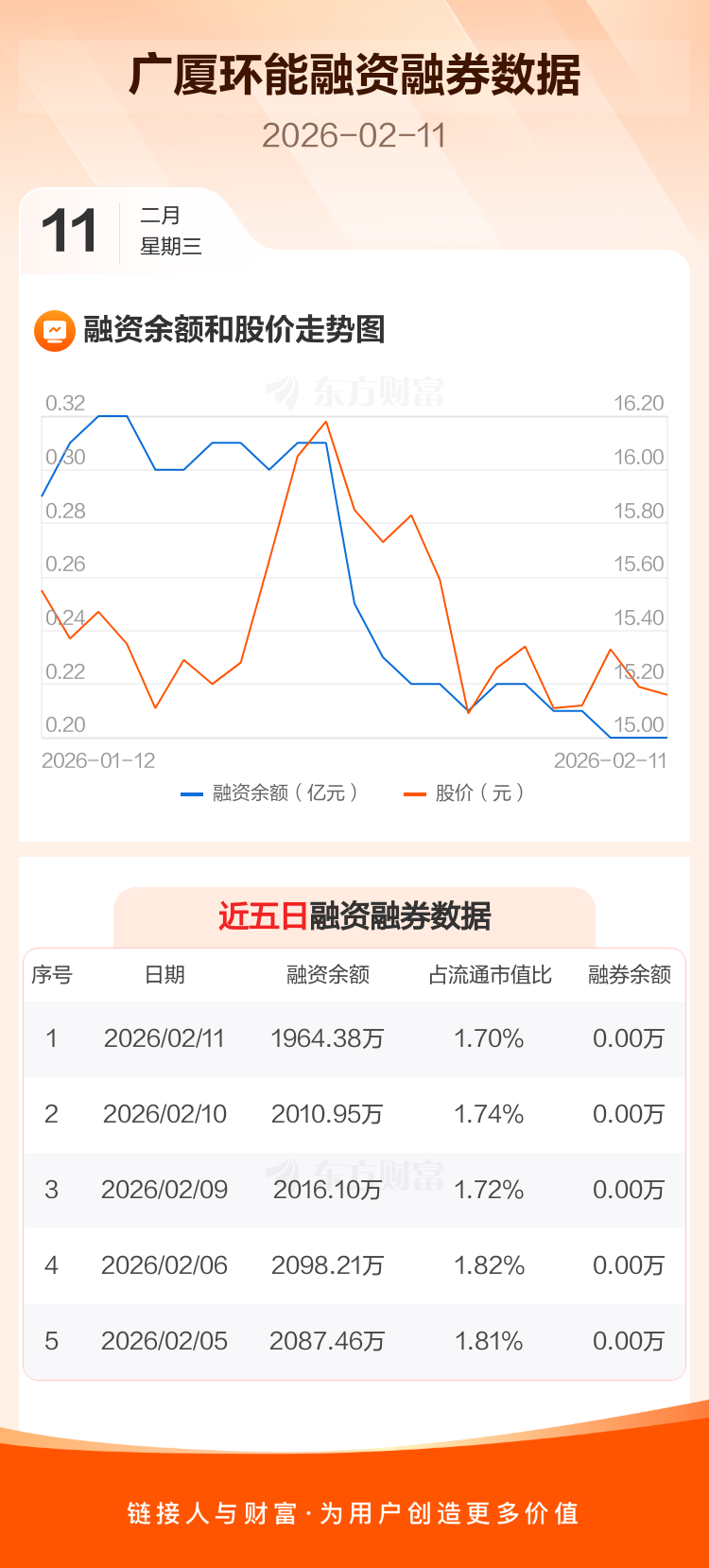 交易所最新数据显示,广厦环能于2026年2月11日获融资买入324.21万元,融资偿还370.78万元,当日融资净偿还46.57万元。目前,该股融资余额1964.38万,占流通市值比例为1.70%。