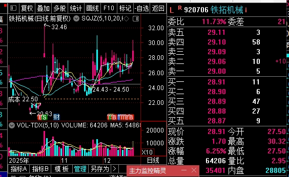 $铁拓机械(SZ920706)$ 连续买入成本做到了22.5.今天一个大阳跑了,有机会再接