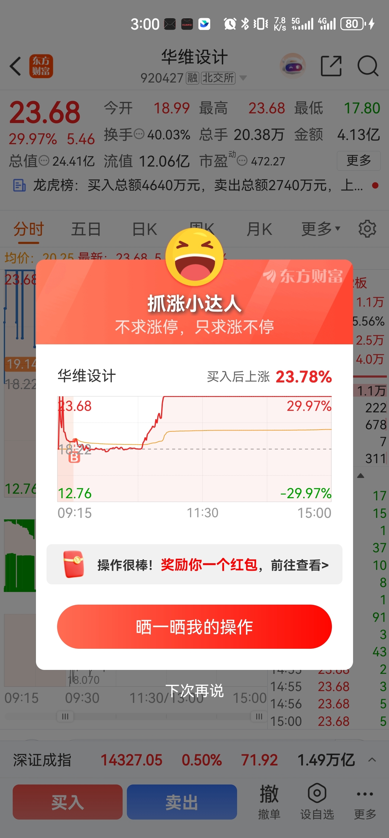 开盘进的$华维设计(SZ920427)$ 明天不涨停的话,冲高也会出了,一般北交所顶多也就是个三板,难以逾越,看看明天开盘的强度再说,三成仓,挣了就跑没啥压力~