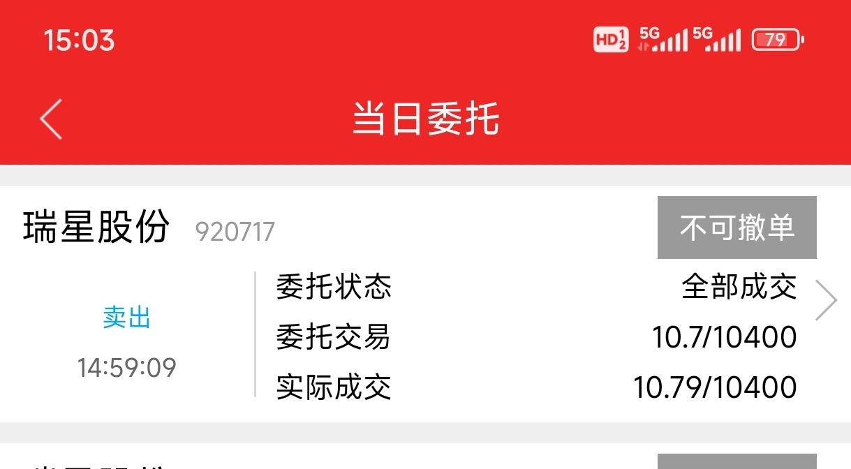 $瑞星股份(SZ920717)$ 上午卖了平均瑞星平均价10.87-10.88之间,忘记两融这边还有1万多股,直接59分挂10.7卖了,看到头痛,上午卖的在别地方赚了3个点回来,祝留下的发财。