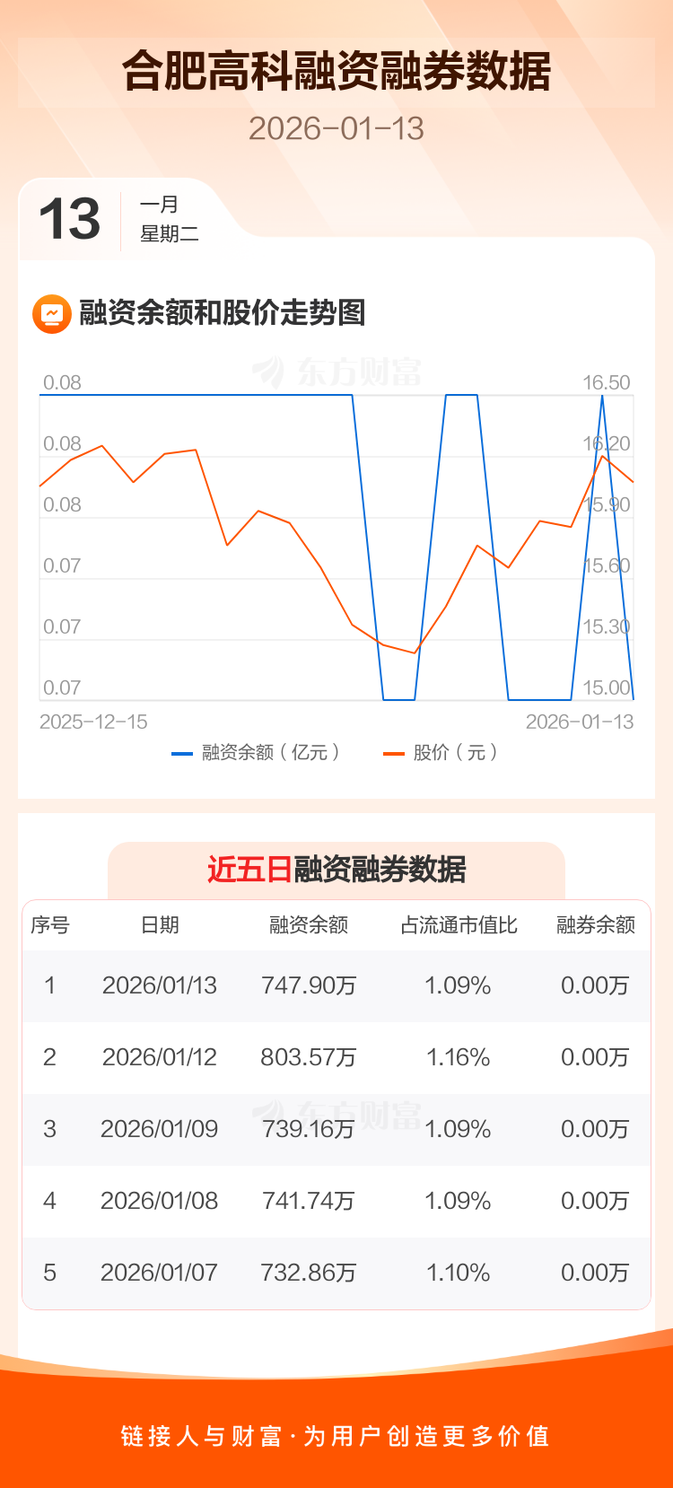 交易所最新数据显示,合肥高科于2026年1月13日获融资买入178.50万元,融资偿还234.16万元,当日融资净偿还55.66万元。目前,该股融资余额747.90万,占流通市值比例为1.09%。