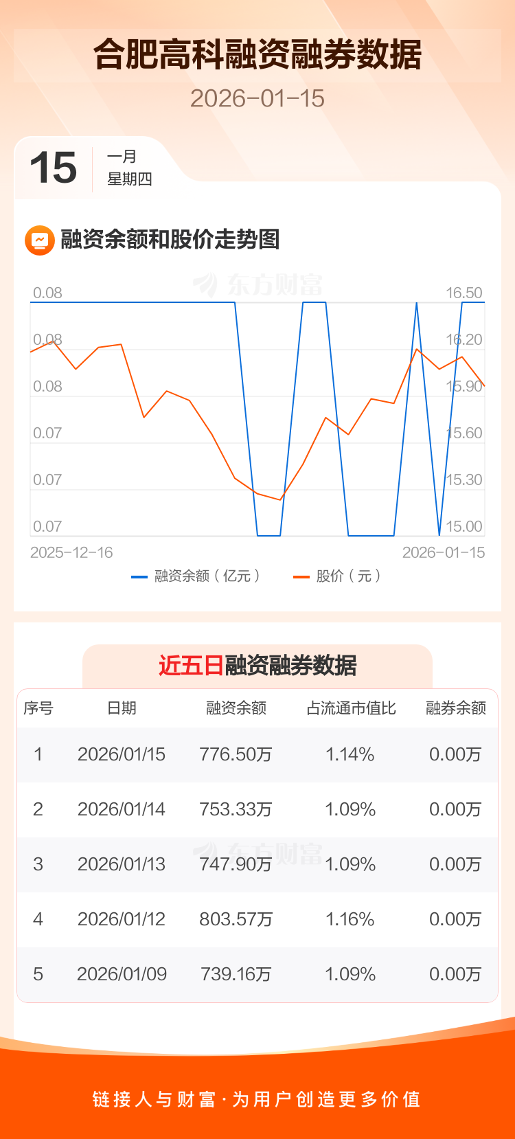 交易所最新数据显示,合肥高科于2026年1月15日获融资买入183.05万元,融资偿还159.87万元,当日融资净买入23.18万元。目前,该股融资余额776.50万,占流通市值比例为1.14%。