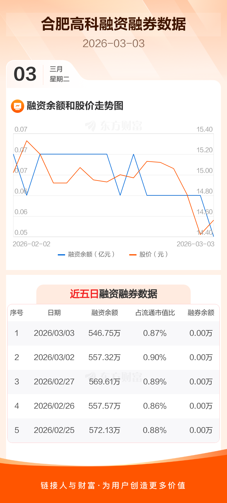 交易所最新数据显示,合肥高科于2026年3月3日获融资买入57.87万元,融资偿还68.43万元,当日融资净偿还10.56万元。目前,该股融资余额546.75万,占流通市值比例为0.87%。