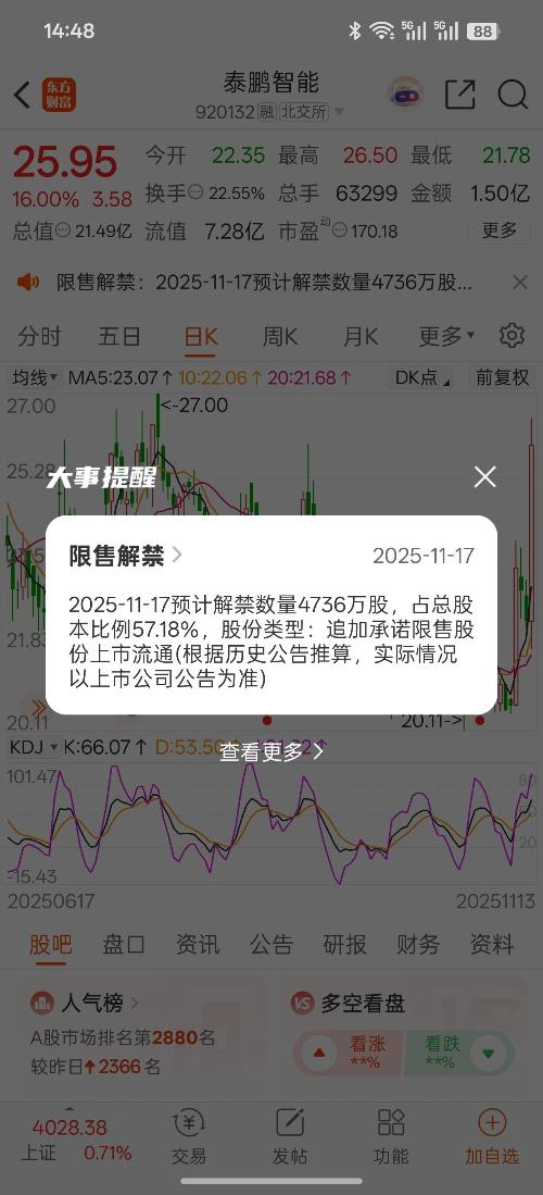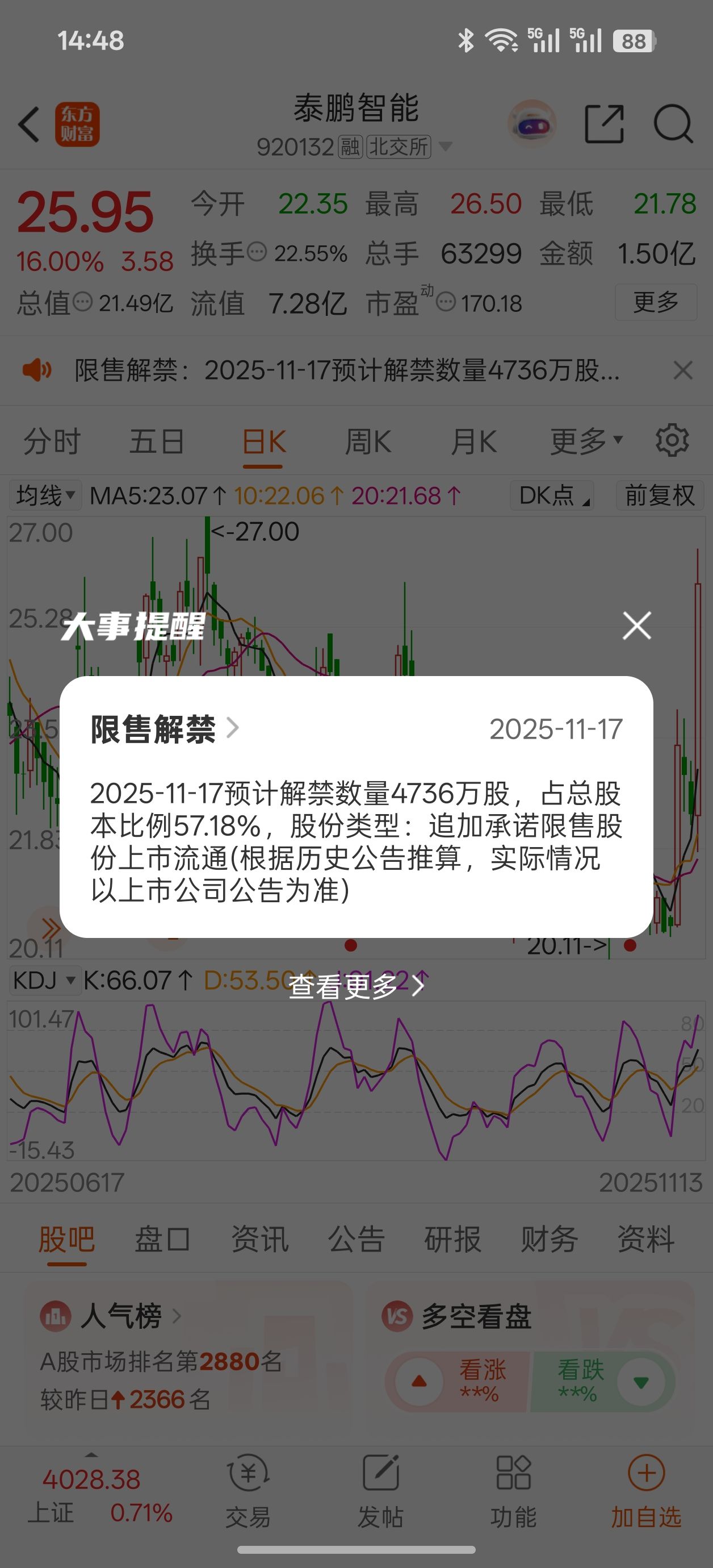 兄弟们,不要怕了,坚持下去,我看到了一个股票也是大解禁,今天大涨!留下的兄弟有希望啦