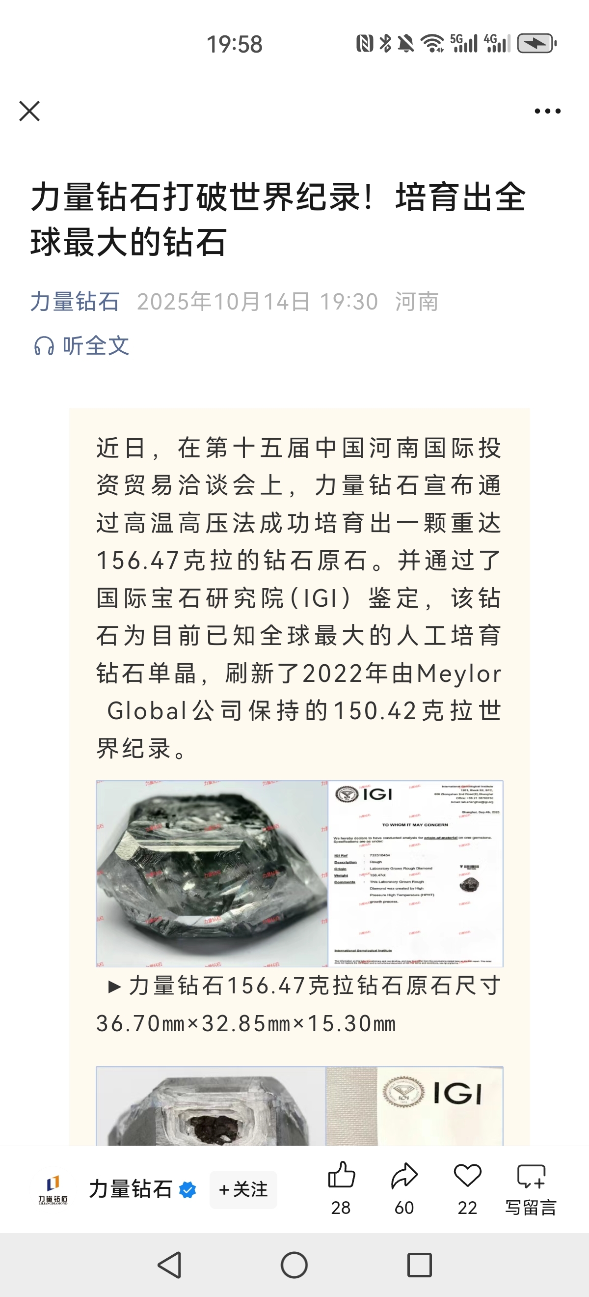 19:30分,来自公司官微 力量钻石打破世界纪录!培育出全球最大的钻石。