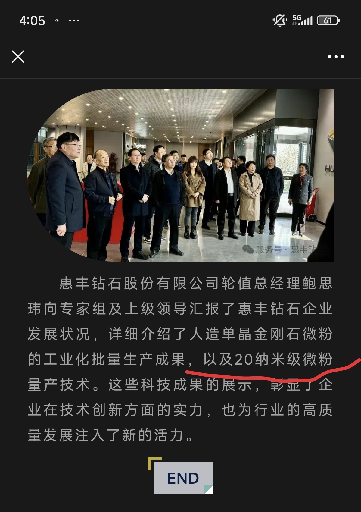 $惠丰钻石(SZ920725)$ $北证50(SZ899050)$ 惠丰全球最大(20亿克拉/年)钻石微粉生产厂家,能生产20纳米大小的金刚石,技术独一档,直接卡住全球芯片、光刻机等生产命门,整个欧美科技发展全部停滞。
