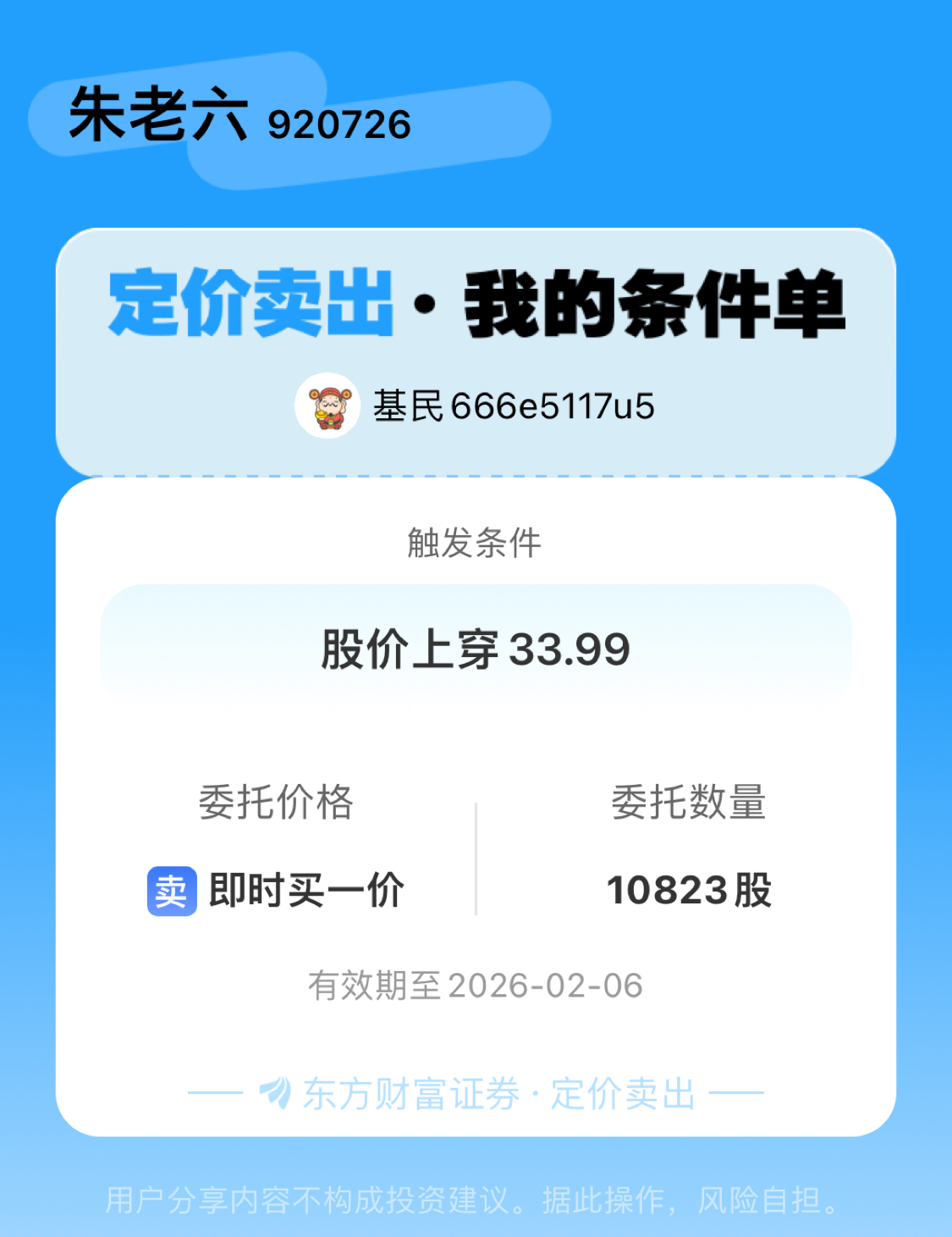 #条件单交流# #定价卖出晒单# 一位股神设置了一个定价卖出条件单,接下来就是见证奇迹的时刻~$朱老六(SZ920726)$