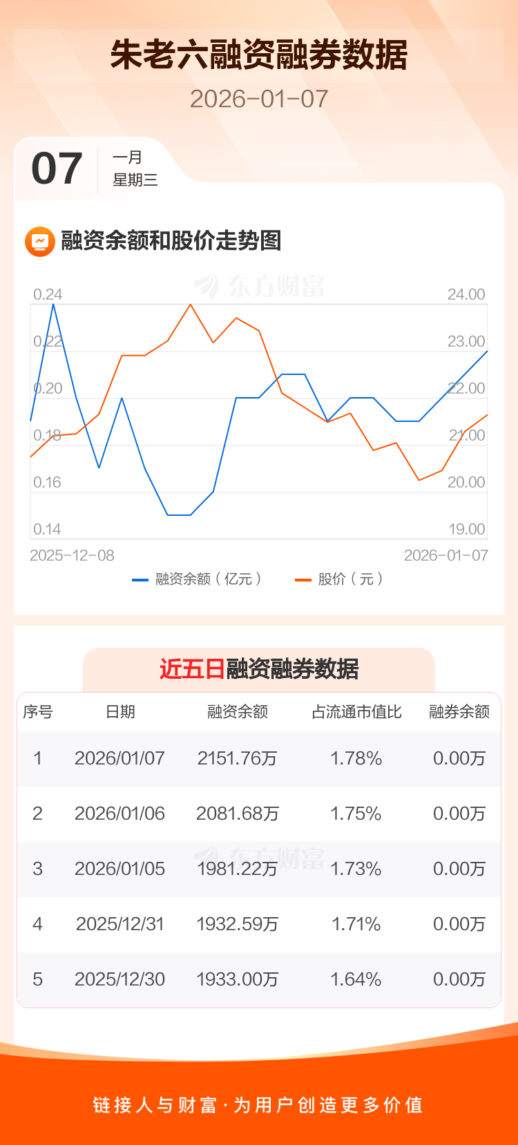 交易所最新数据显示,朱老六于2026年1月7日获融资买入459.09万元,融资偿还389.01万元,当日融资净买入70.08万元。目前,该股融资余额2151.76万,占流通市值比例为1.78%。