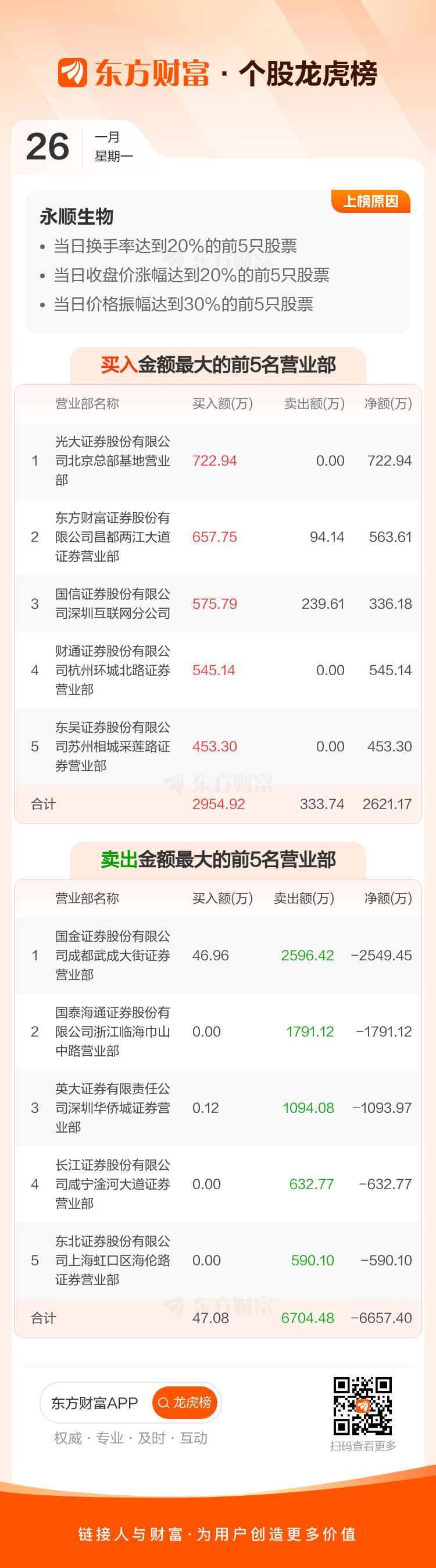 交易所2026年1月26日公布的交易公开信息显示,永顺生物因成为当日换手率达到20%的前5只股票、当日收盘价涨幅达到20%的前5只股票、当日价格振幅达到30%的前5只股票上榜。永顺生物当日收报11.79元,涨跌幅27.18%,偏离值38.08%,换手率38.08%,成交额3.28亿。
