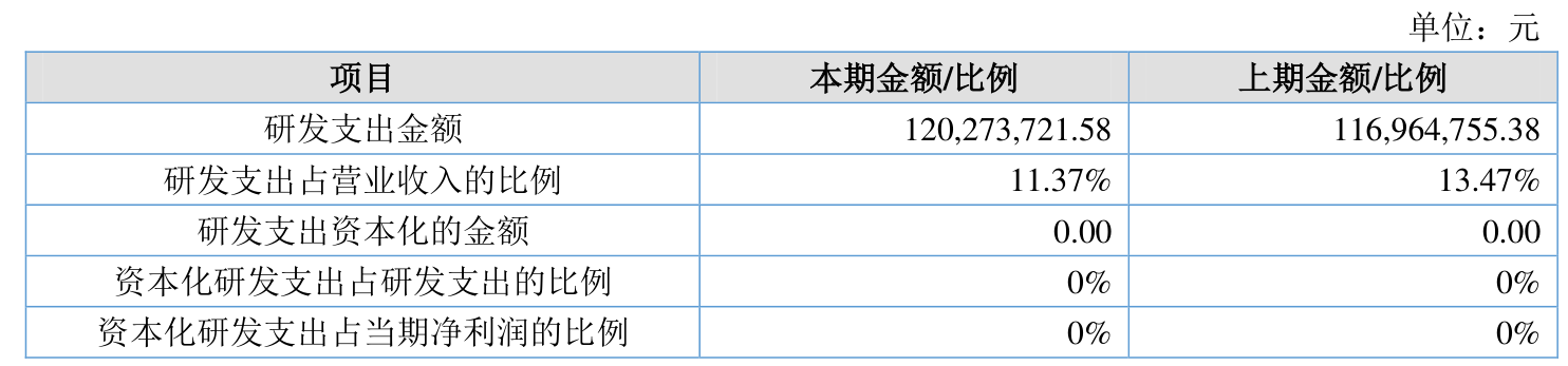 2025年全年,公司研发投入金额为1.2亿元,同比增长2.83%;研发投入占营业收入比例为11.37%,相比上年同期下降2.1个百分点。此外,公司全年研发投入资本化率为0%。