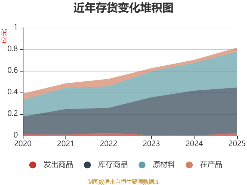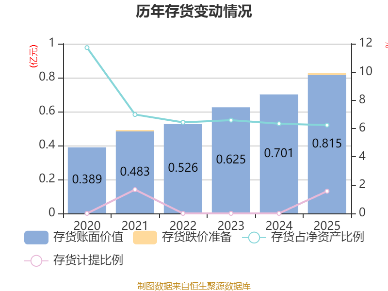 从存货变动来看,截至2025年末,公司存货账面价值为8150.2万元,占净资产的6.24%,较上年末增加1136.07万元。其中,存货跌价准备为129.82万元,计提比例为1.57%。