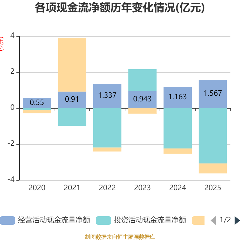 截至2025年,公司经营活动现金流净额为1.57亿元,同比增长34.68%;筹资活动现金流净额-5558.03万元,同比减少2604.22万元;投资活动现金流净额-3.08亿元,上年同期为-2.25亿元。