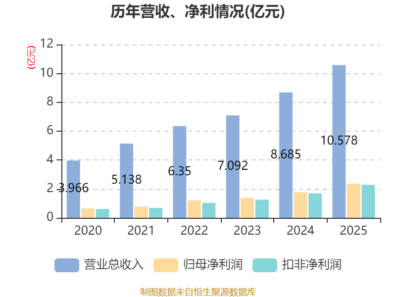中证智能财讯德源药业(920735)3月5日披露2025年年度报告。2025年,公司实现营业总收入10.58亿元,同比增长21.80%;归母净利润2.37亿元,同比增长33.87%;扣非净利润2.29亿元,同比增长34.79%;经营活动产生的现金流量净额为1.57亿元,同比增长34.68%;报告期内,德源药业基本每股收益为2.02元,加权平均净资产收益率为19.74%。公司2025年度分配预案为:拟向全体股东每10股转1股,派现4元(含税)。