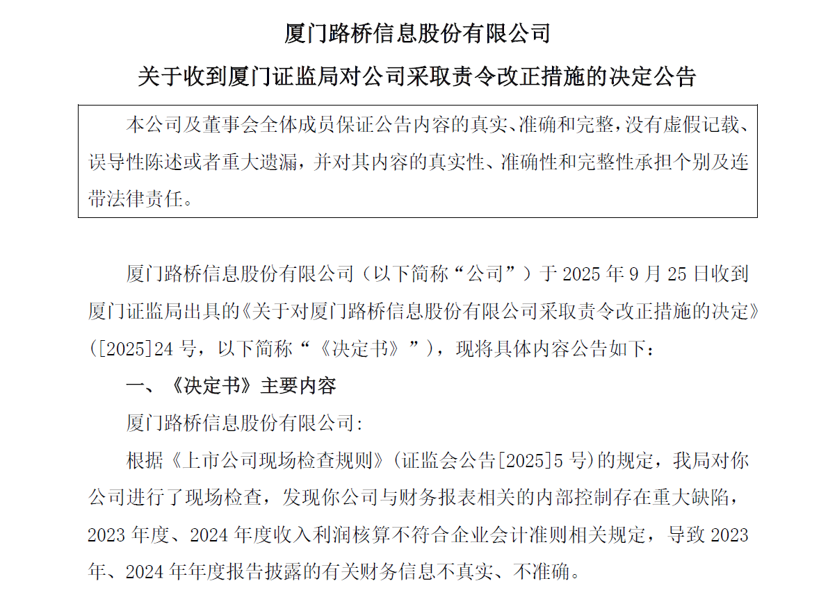 路桥信息索赔登记。内部控制存在重大缺陷,收入利润核算不符合企业会计准则,收责令改