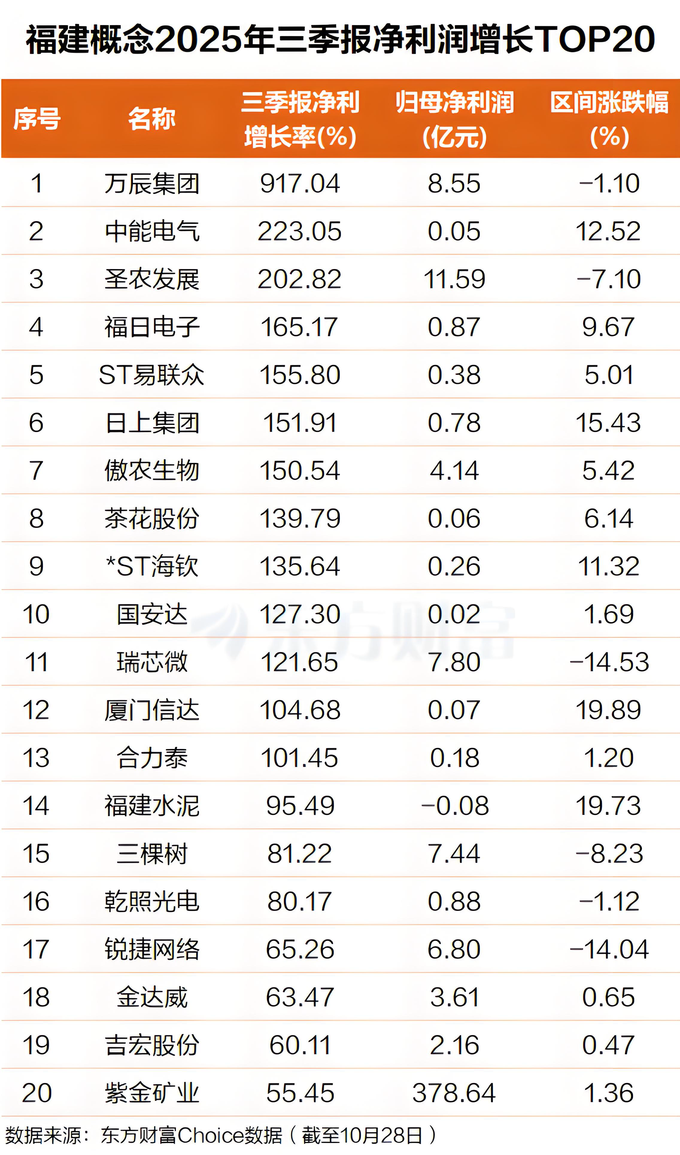 而从2025年三季报净利润增长角度看,东方财富Choice数据显示,截至2025年10月28日发稿,13只个股三季报净利润增长超100%,其中万辰集团三季报净利润增长超900%;中能电气排名第二,三季报净利润增长超220%。
