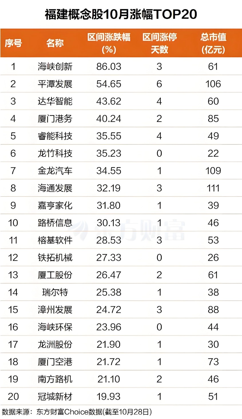 东方财富Choice数据显示,10月至今福建本地概念股表现强势,从涨幅角度看,海峡创新排名第一,累计涨幅超86%,期间总计走出过3个20CM涨停;平潭发展排名第二,累计涨幅接近55%,期间走出过6个涨停。
