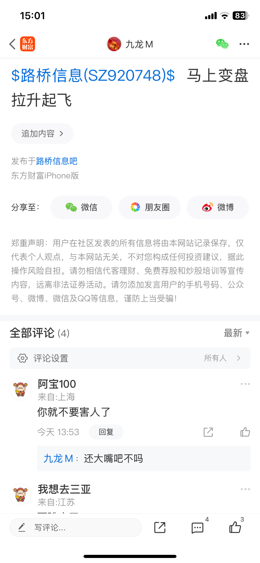 温馨提示: 1.根据《证券法》规定,禁止编造、传播虚假信息或者误导性信息,扰乱证券市场;2.用户在本社区发表的所有资料、言论等仅代表个人观点,与本网站立场无关,不对您构成任何投资建议。用户应基于自己的独立判断,自行决定证券投资并承担相应风险。《东方财富社区管理规定》