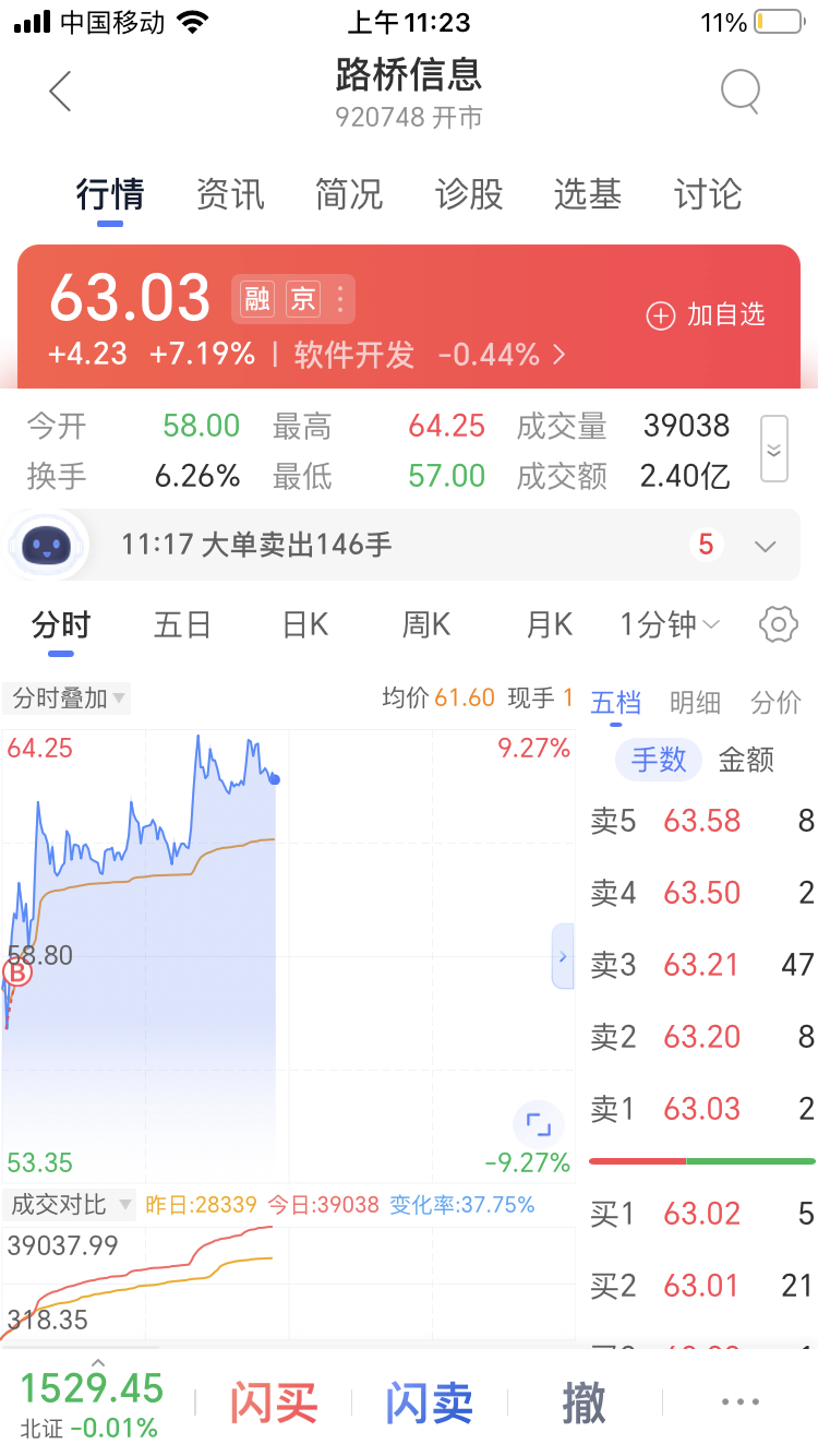 $路桥信息(SZ920748)$ 挂的57.01,盘中富贵