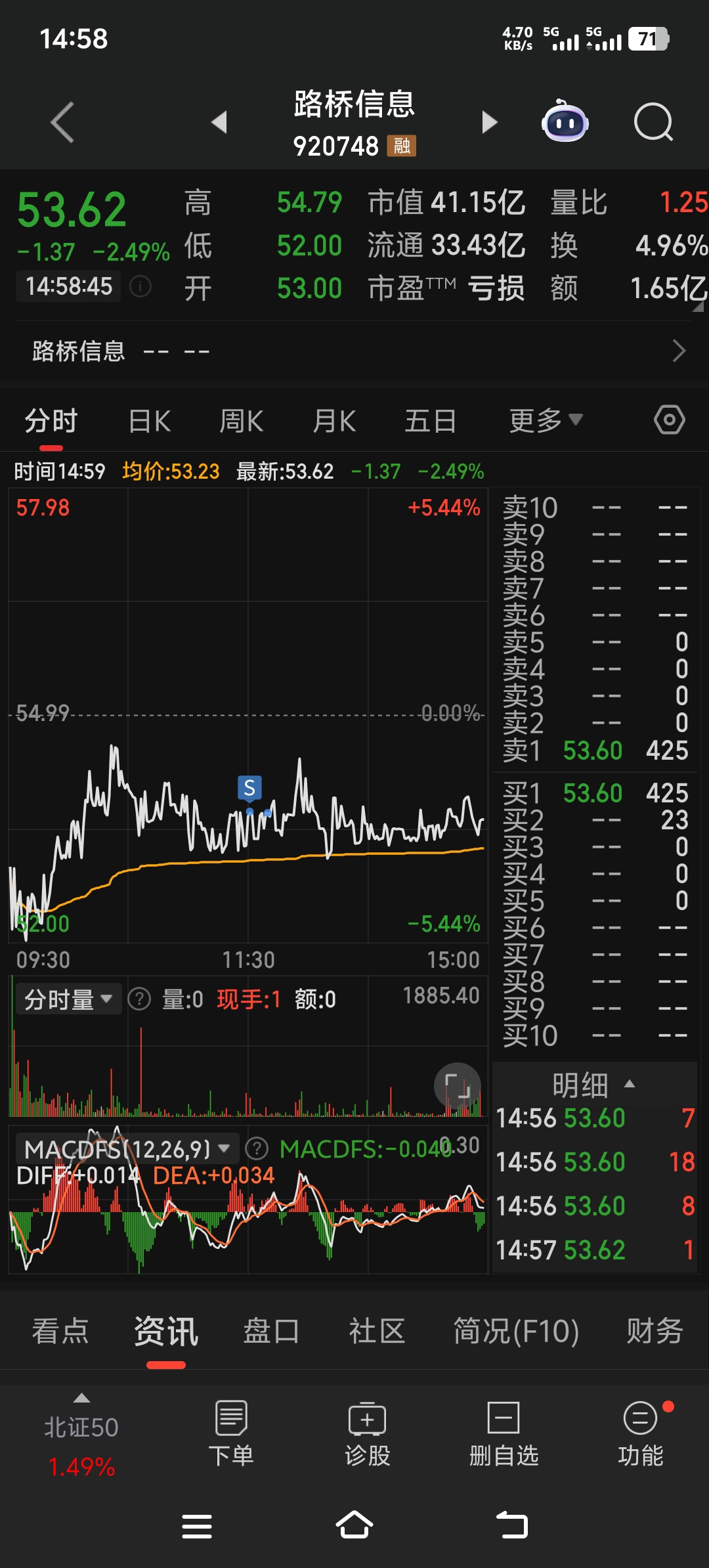 $路桥信息(SZ920748)$ 周五在天润和路桥2个股里选了路桥信息,理由是路桥最近表现比天润强势。结果周一天润涨了25%以上,路桥直接闷杀。今天才知道路桥信息被立案调查,已经是一个月前的公告了,所以止损了,止损的理由是被立案调查的股不确定大。还好当时考虑到成交量的问题,买的不多,就入了100多手。