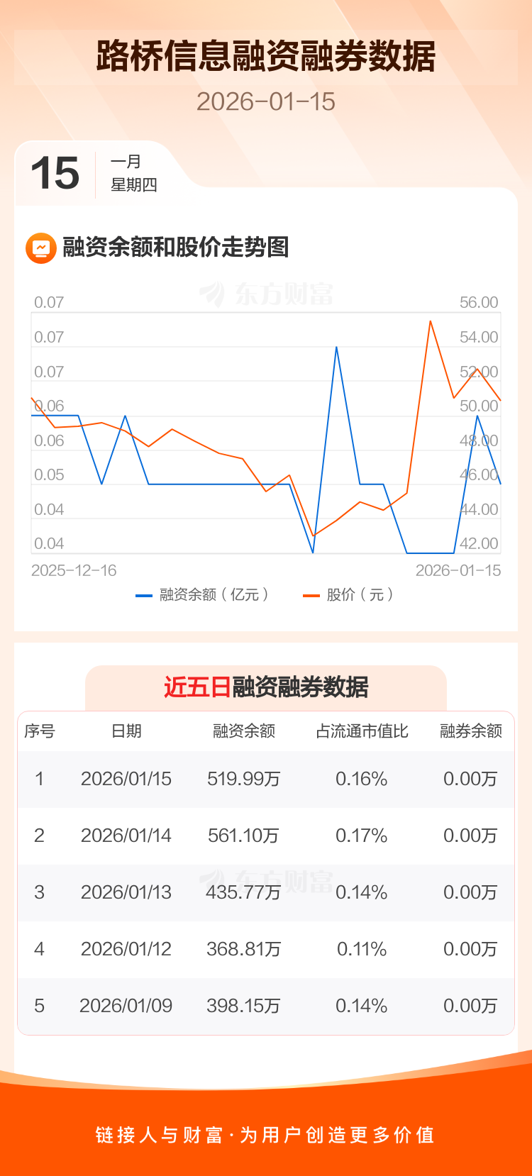 交易所最新数据显示,路桥信息于2026年1月15日获融资买入17.45万元,融资偿还58.56万元,当日融资净偿还41.11万元。目前,该股融资余额519.99万,占流通市值比例为0.16%。