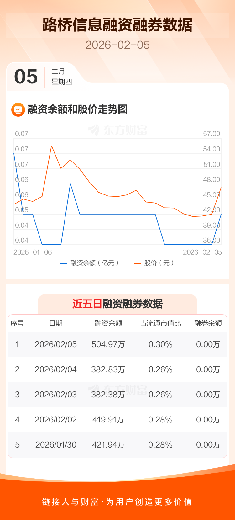 交易所最新数据显示,路桥信息于2026年2月5日获融资买入247.81万元,融资偿还125.67万元,当日融资净买入122.14万元。目前,该股融资余额504.97万,占流通市值比例为0.30%。