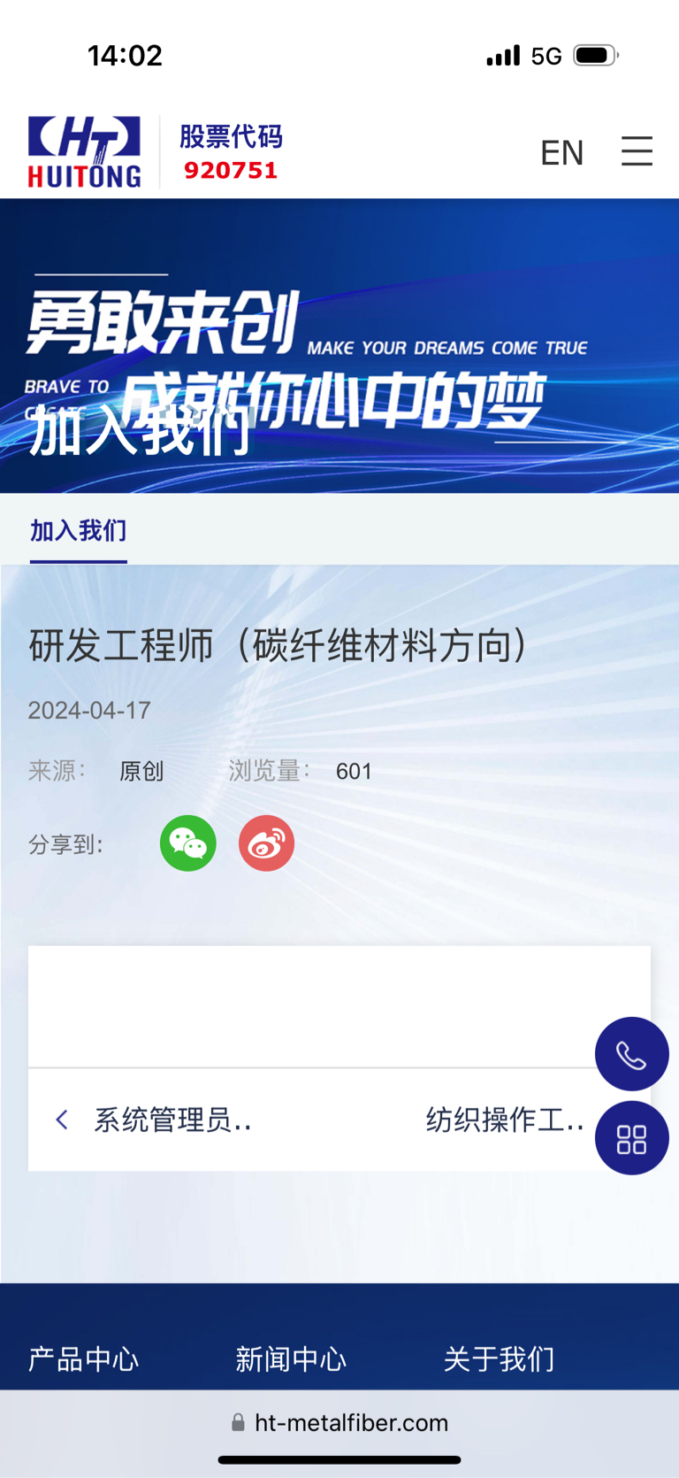 $惠同新材(SZ920751)$ 我就说去年我在官网看到公司碳纤维材料的招聘吧!!
