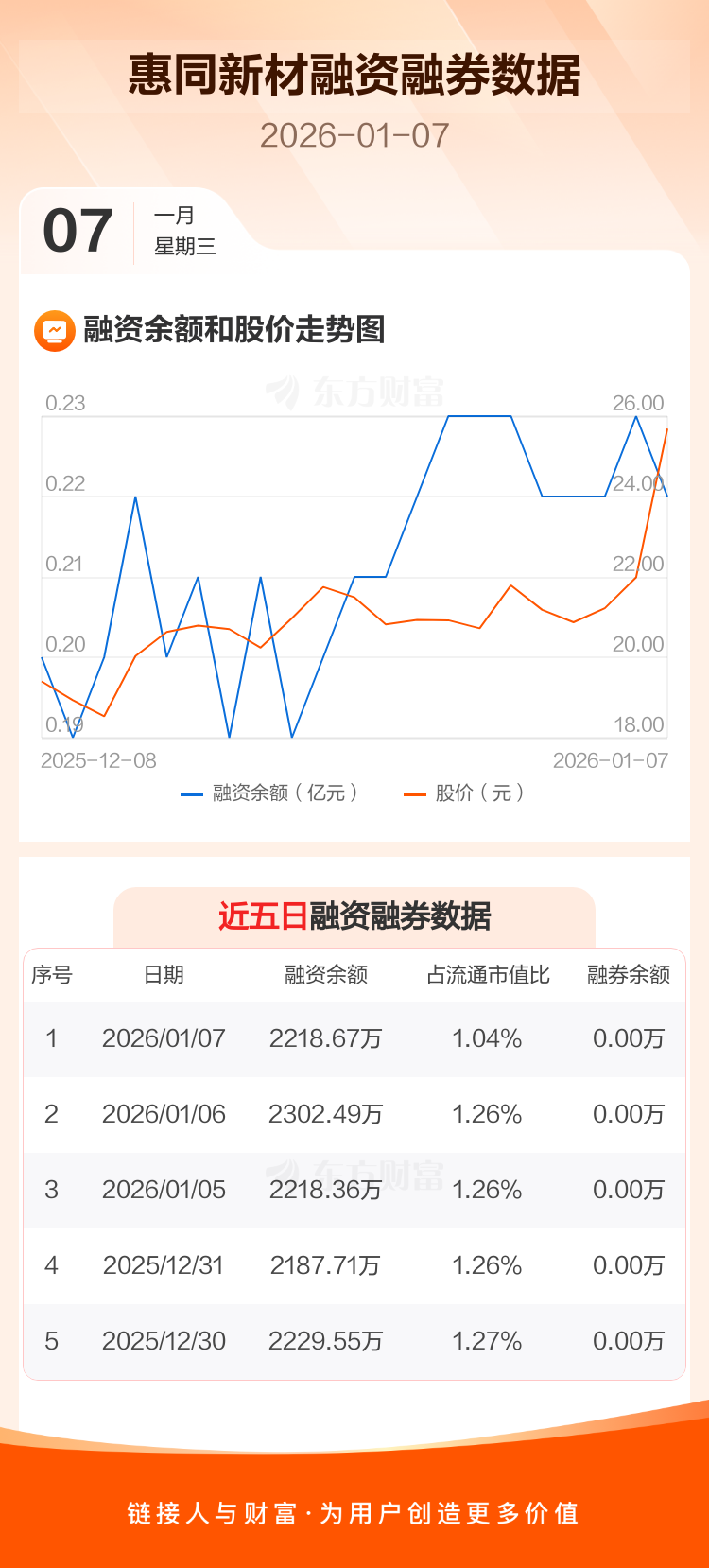 惠同新材:融资净偿还83.82万元,融资余额2218.67万元
