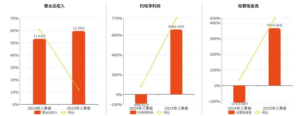 公司营业总收入为13.35亿元。归母净利润为4582.43万元,在已披露的同业公司中排名第22。经营活动现金净流入为7574.45万元,在已披露的同业公司中排名第17。