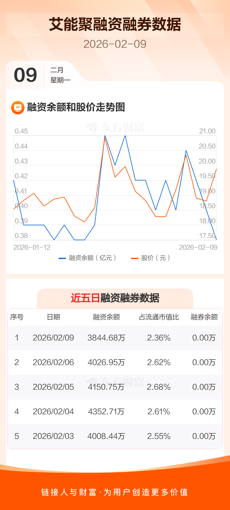 交易所最新数据显示,艾能聚于2026年2月9日获融资买入725.27万元,融资偿还907.54万元,当日融资净偿还182.27万元。目前,该股融资余额3844.68万,占流通市值比例为2.36%。
