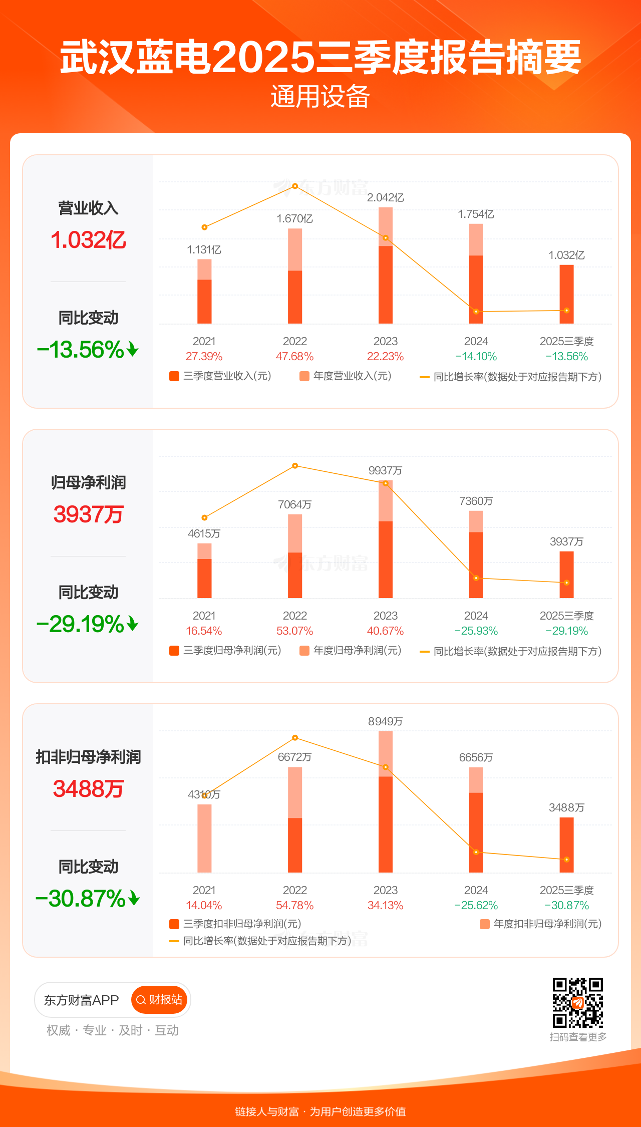 武汉蓝电10月29日发布2025年三季报显示,公司前三季实现营业收入1.03亿元,同比下滑13.56%;归母净利润3936.76万元,同比下滑29.19%;扣非归母净利润3487.95万元,同比下滑30.87%。