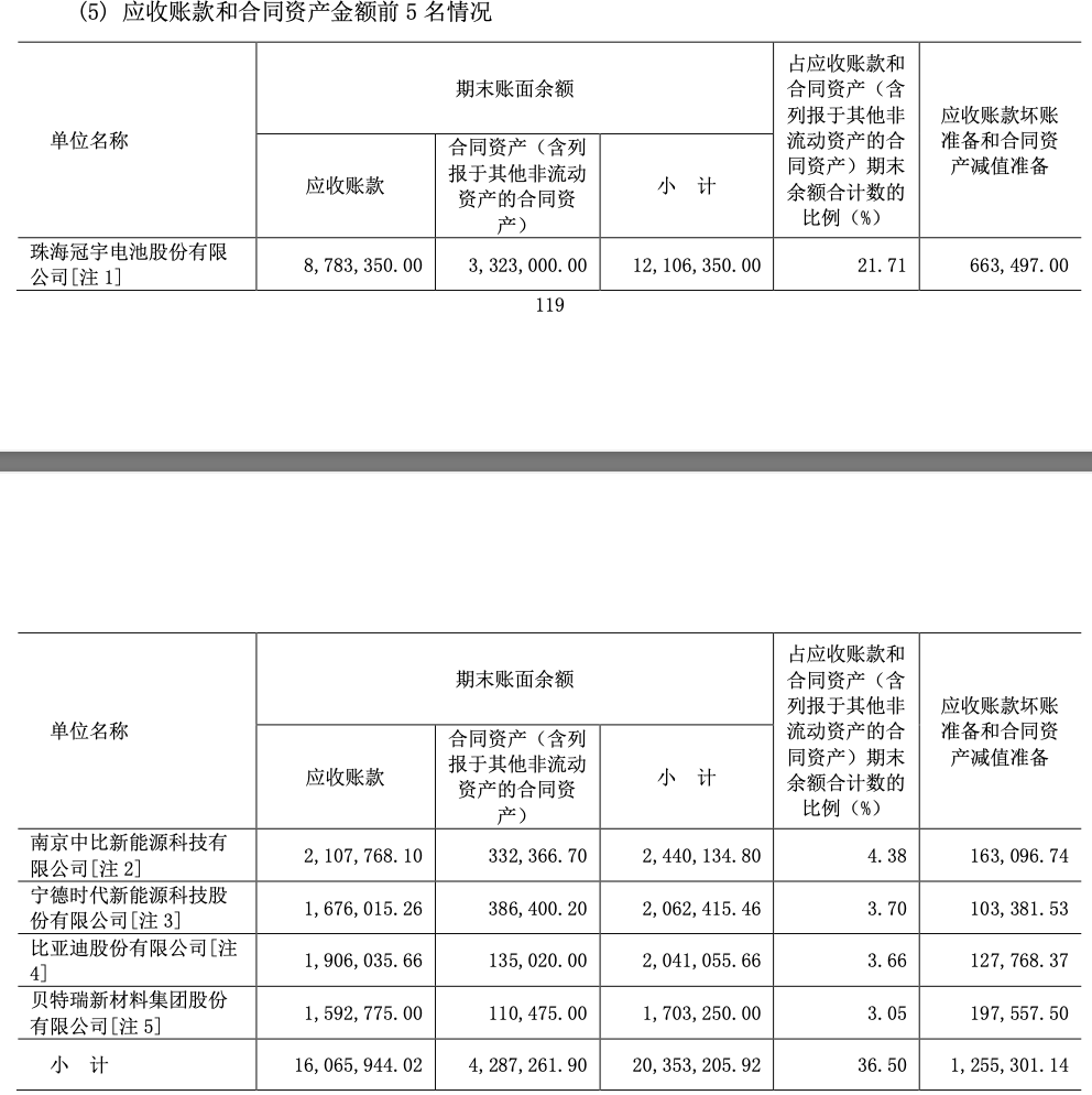 年报同时披露了公司应收账款及合同资产金额前5名的明细情况。报告期末,排名第一的客户为珠海冠宇电池股份有限公司,公司对其应收账款及合同资产合计余额达1210.64万元,占应收账款与合同资产期末余额合计数的21.71%。