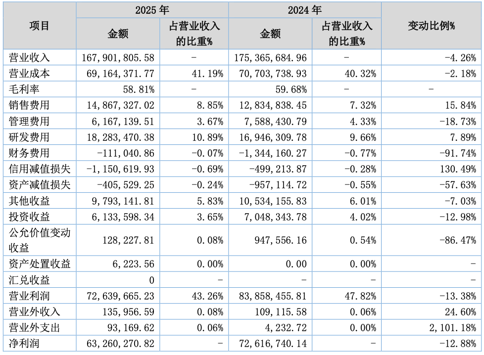 报告期内,公司实现营业收入167,901,805.58元,较上年同期减少4.26%,主要系期末已发货尚未验收的合同金额同比增加;归属于上市公司股东的净利润62,805,847.96元,较上年同期减少14.66%,主要系收入略有下降以及公司对部分产品调整单价导致毛利率下降综合影响所致。