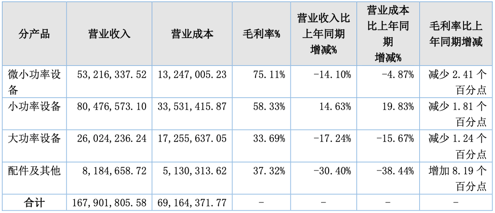 报告期内,公司微小功率设备、大功率设备、配件及其他收入均有所下降。