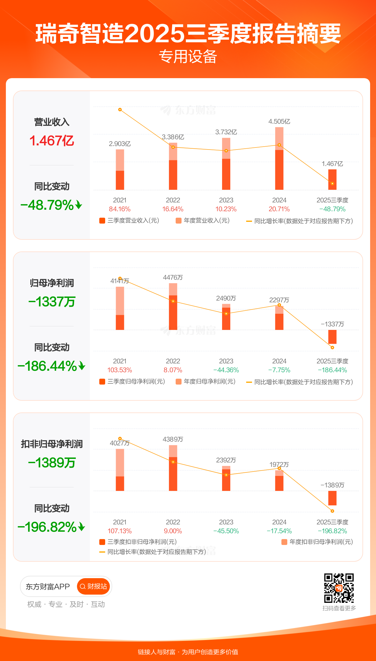 瑞奇智造10月29日发布2025年三季报显示,公司前三季实现营业收入1.47亿元,同比下滑48.79%;归母净利润-1337.39万元;扣非归母净利润-1388.93万元。