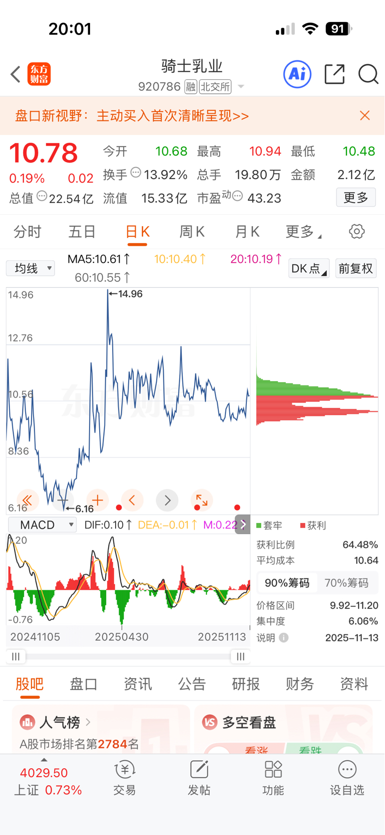 $骑士乳业(SZ920786)$ 主力双筹码峰已形成,明天看突破11.4强压力位