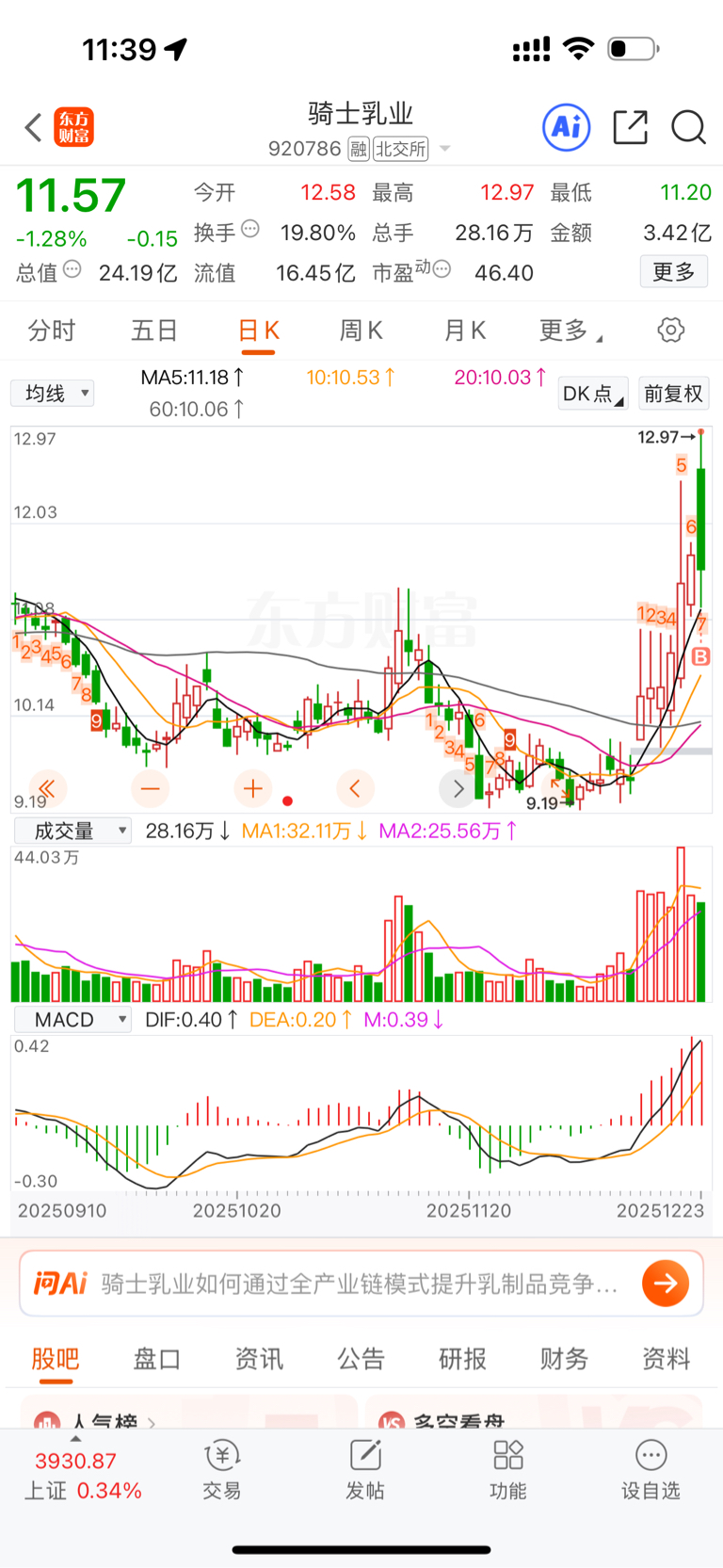 $骑士乳业(SZ920786)$ 再也不信任何利好了,竞价我还以为买不上我挂了13块钱,结果12.97成交。现在气的我想骂娘