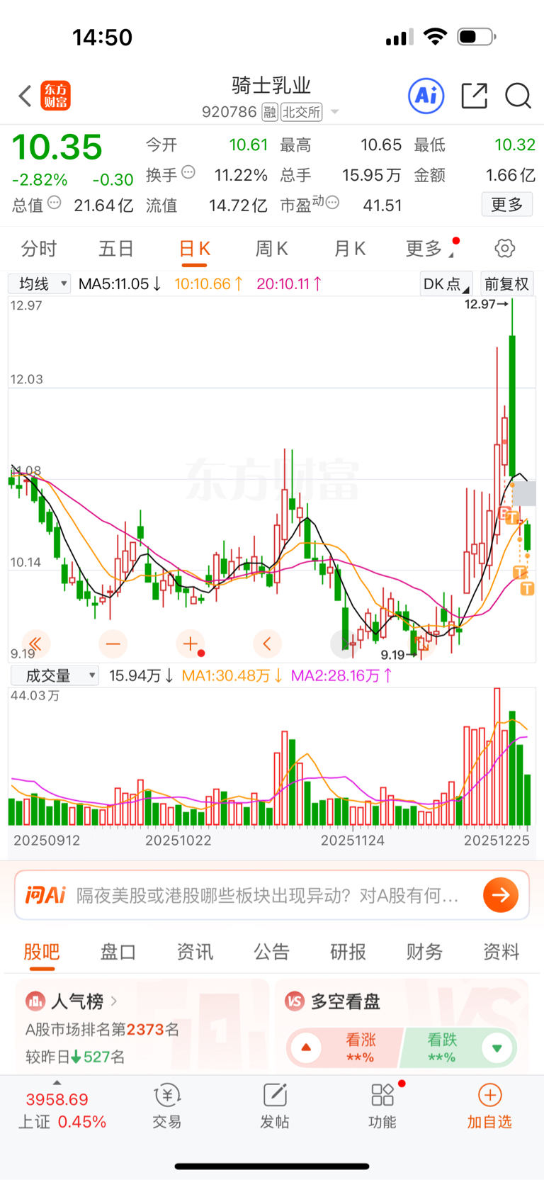 $骑士乳业(SZ920786)$ 求跌停