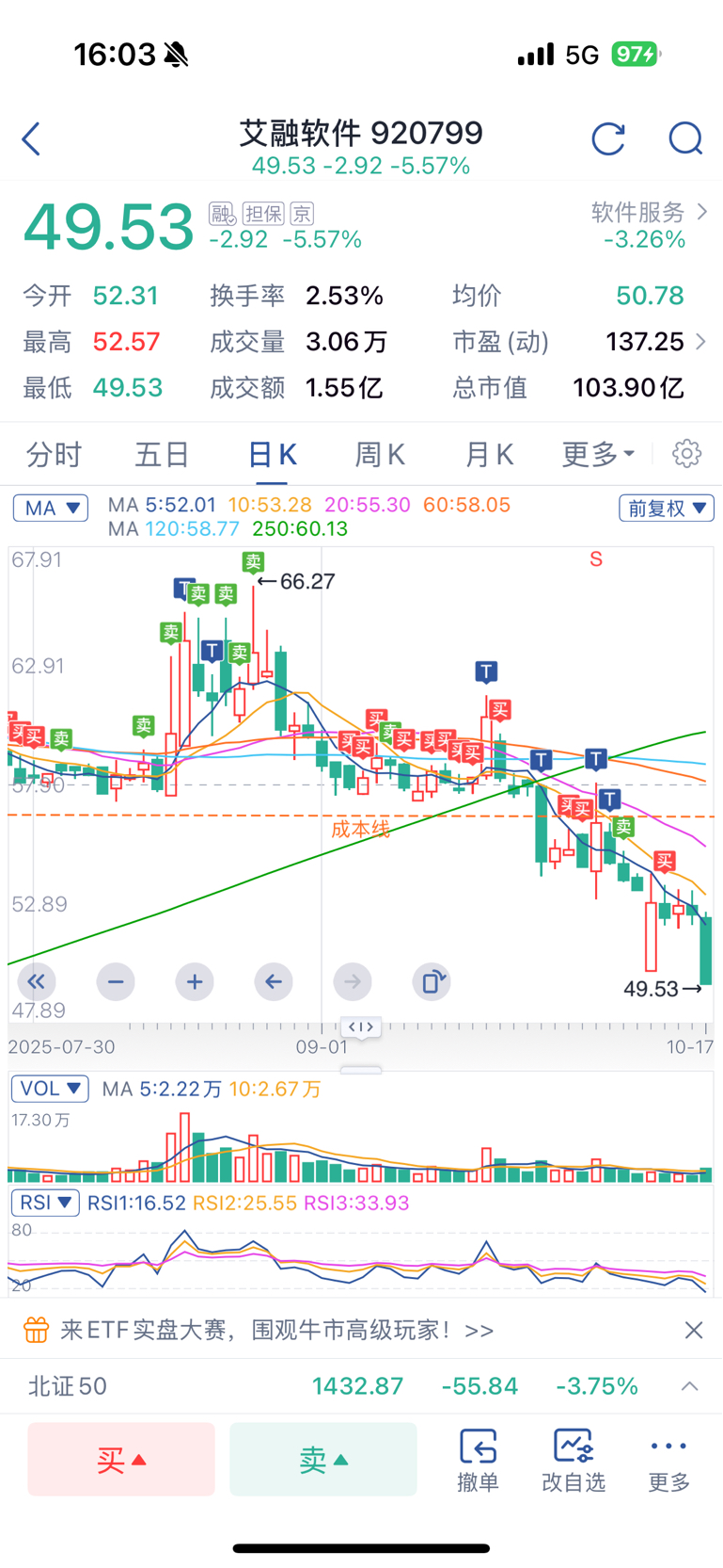 $艾融软件(SZ920799)$ 有预感亏两个月了,可能接下来某个交易日就能回本。30cm的票,主力会埋伏很久,现在没有绝对好的消息推动,只能按兵不动了。大家也减少盘中做T,避免卖飞。如果不看好的,就果断卖了吧!