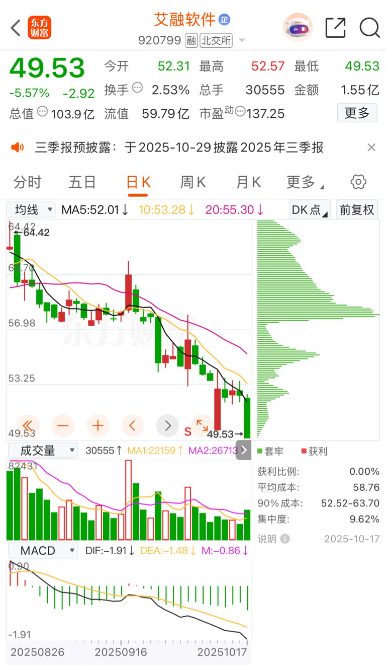 $艾融软件(SZ920799)$ 跌跌不休,主力还能获利?