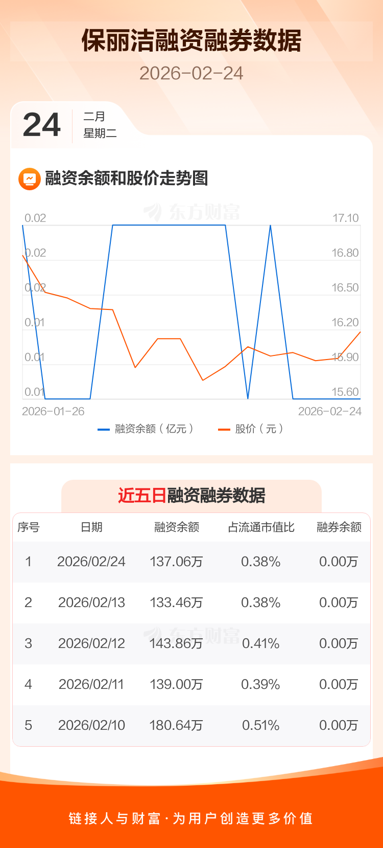 交易所最新数据显示,保丽洁于2026年2月24日获融资买入7.46万元,融资偿还3.86万元,当日融资净买入3.6万元。目前,该股融资余额137.06万,占流通市值比例为0.38%。