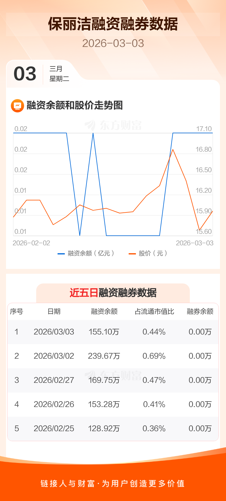 交易所最新数据显示,保丽洁于2026年3月3日获融资买入19.70万元,融资偿还104.26万元,当日融资净偿还84.57万元。目前,该股融资余额155.10万,占流通市值比例为0.44%。
