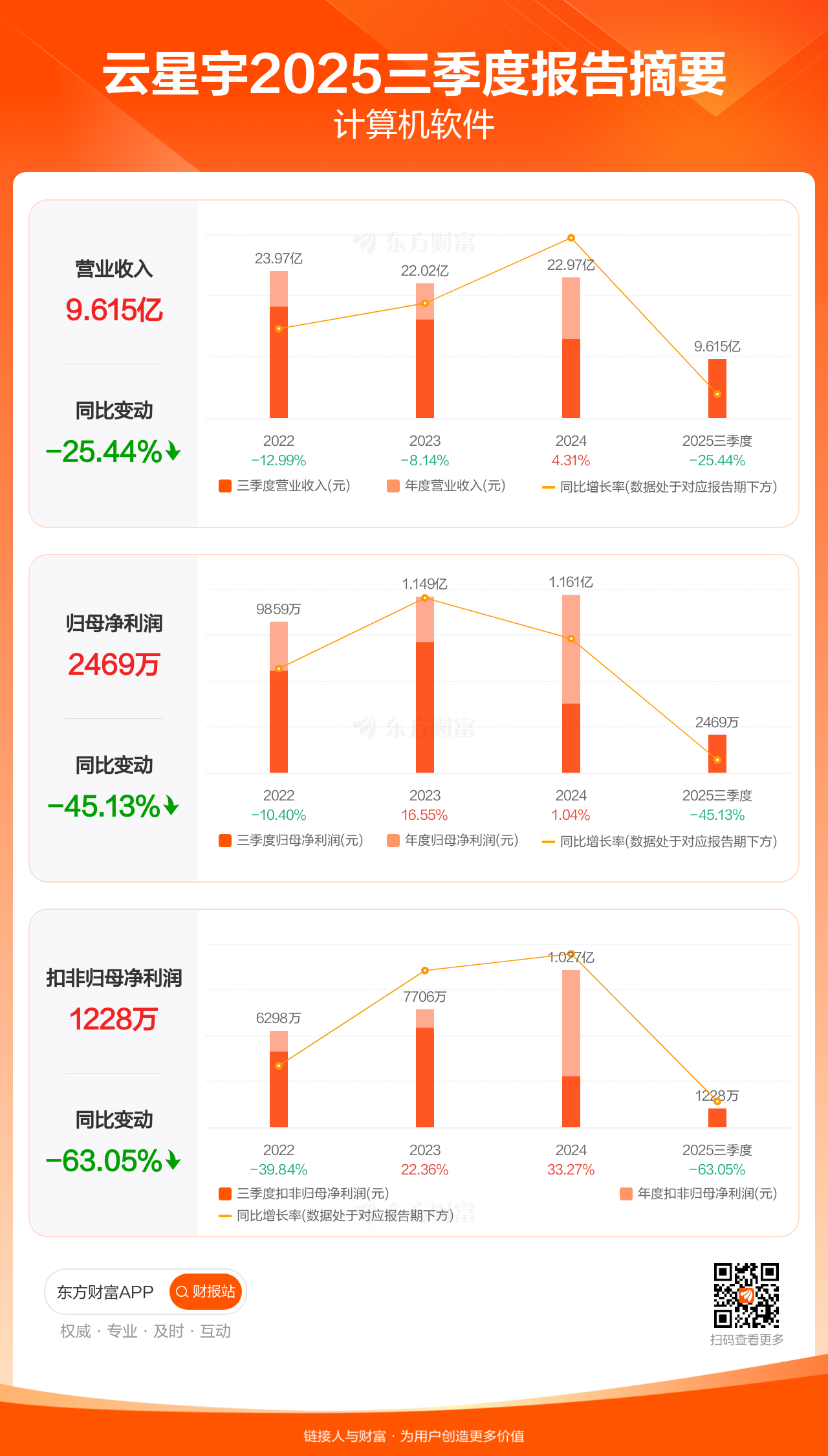 云星宇10月29日发布2025年三季报显示,公司前三季实现营业收入9.61亿元,同比下滑25.44%;归母净利润2468.75万元,同比下滑45.13%;扣非归母净利润1228.37万元,同比下滑63.05%。