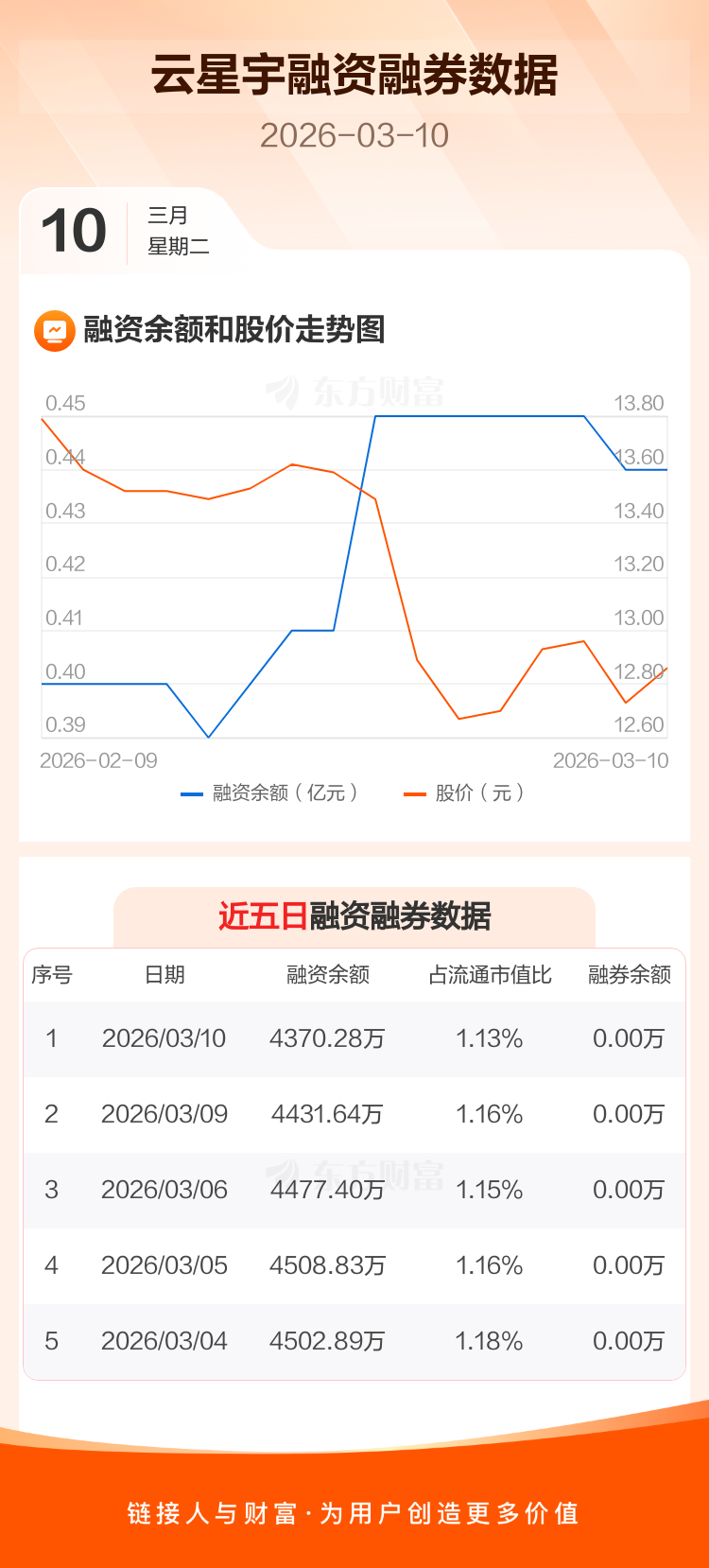 交易所最新数据显示,云星宇于2026年3月10日获融资买入136.31万元,融资偿还197.67万元,当日融资净偿还61.36万元。目前,该股融资余额4370.28万,占流通市值比例为1.13%。
