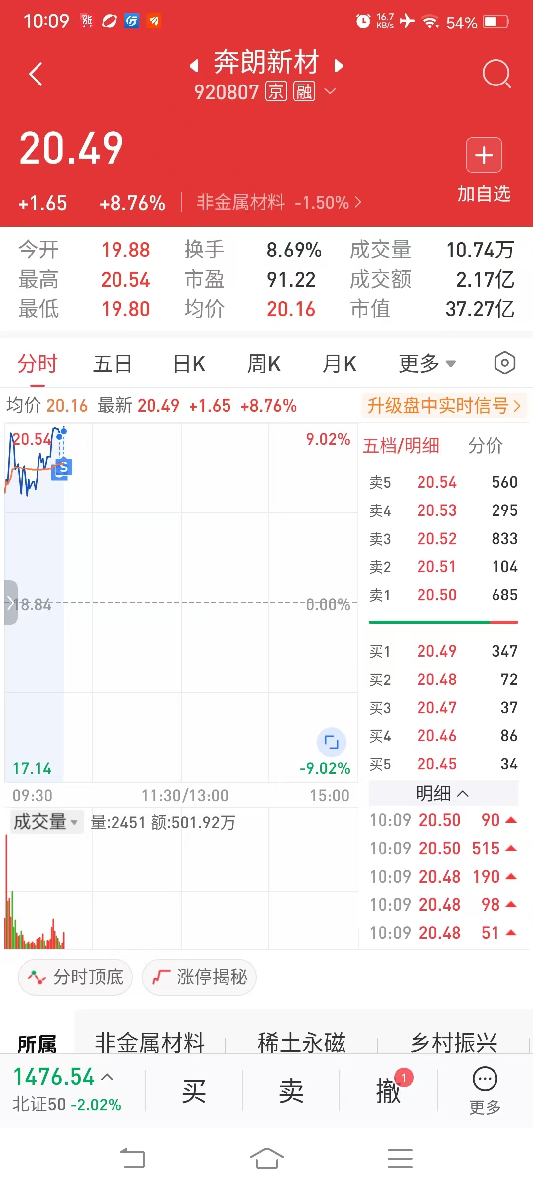 $奔朗新材(SZ920807)$ 还是差点才能20.63卖不过也够了毕竟北证大盘今天还是大跌