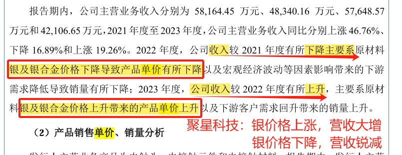 〖公告原文〗2022年公司收入较 2021年度有所下降主要系原材料银及银合金价格下降导致产品单价有所下降。2023年度,公司收入较2022年度有所上升主要系原材银及银合金价格上升带来的产品单价上升(除需求影响)