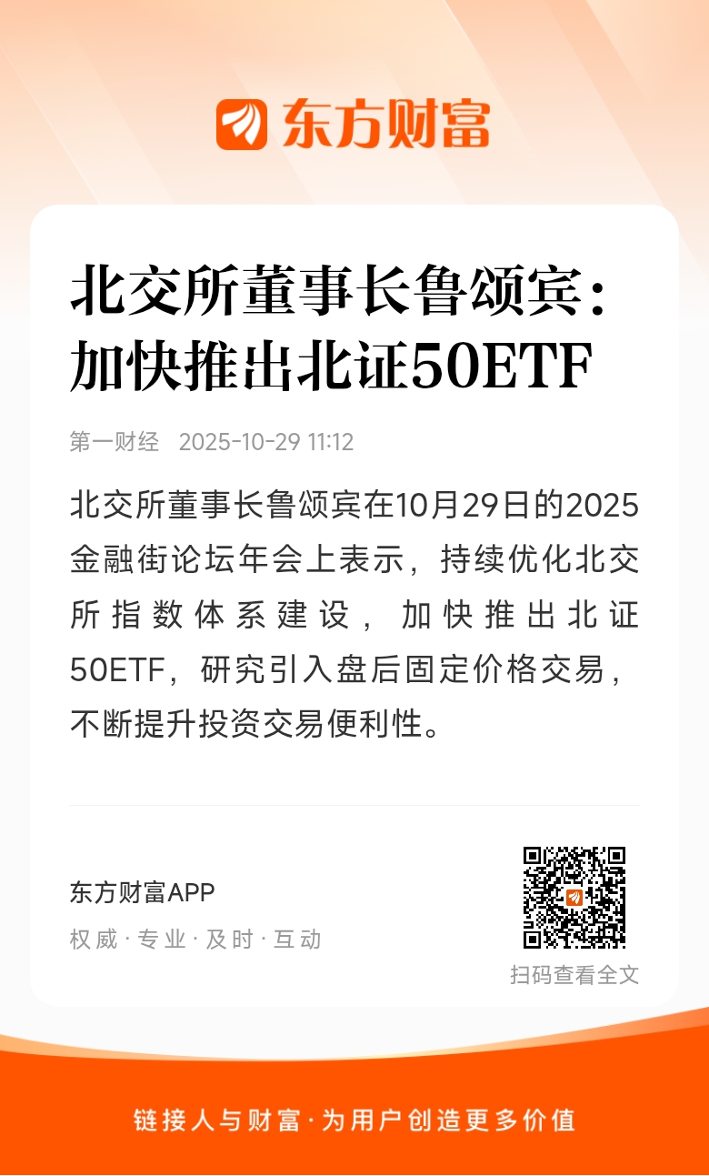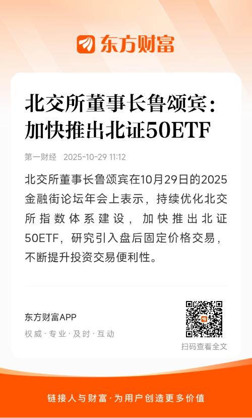 北交所董事长鲁颂宾在10月29日的2025金融街论坛年会上表示,持续优化北交所指数体系建设,加快推出北证50ETF,研究引入盘后固定价格交易,不断提升投资交易便利性。